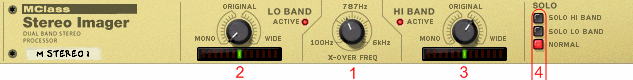 MClass Stereo Imager разделяет сигнал на два частотных диапазона; высокий и низкий и позволяет расширить или сузить стереоизображение каждой группы. Обычно Stereo Imager применяется для расширения более высоких частотах и сужения Стерео базы в низких частотах. Это сделает бас "жестче", тогда как высокие частоты более открытыми.