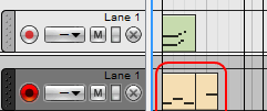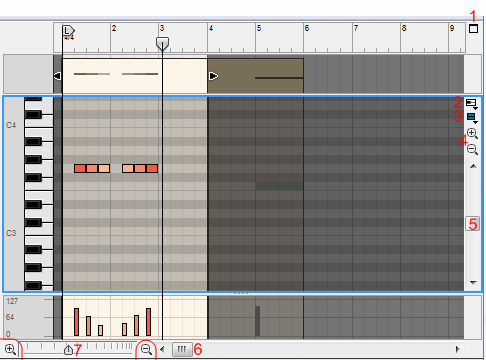Вы также можете изменять длительность мидиклипа в окне самого миди клипа. Для этого воспользуйтесь его верхней частью. Кроме того из окна мидиклипа вы можете создавать новые мидиклипы для дорожки на которой находитесь (см. рис. ниже):