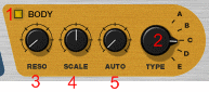 Секция Body представляет собой управление параметром Scale. Последовательная огибающая анализирует амплитуду входящего сигнала и изменяет настройки параметра Scale соответственно - чем громче входящий сигнал, тем выше значение параметра Scale. Операционная частота (или размер) диапазона устанавливается в соответствии с параметром Scale, и количество самой последовательной огибающей устанавливается в соответствии с параметром Auto. Обычно используется для auto-wah эффектов - к примеру тип Body "B" для явного wah эффекта.