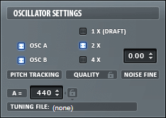 • OSC A (переключатель отслеживания нот осцилляторм A) - переключатель определяет, будет или нет OSC A отслеживать MIDI-ноты, чтобы определять свою высоту тона. Когда выключено, все входящие MIDI-ноты будут запускать OSC А но в низкой частоте. Если вы хотите изменить частоту, вы можете использовать параметры OCT|SEMI|FINE и/или COARSE в модуле осциллятора на главной вкладке OSC.
