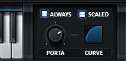 - Scaled (масштабирование) - это потенциально полезно для мелодических лидов, когда вы хотите чтобы скольжение портаменто было менее заметными при небольших интервалах между нотами. При включении, скорость портаменто изменяется в зависимости от интервалов между нотами. Другими словами, если портаменто скользит между двумя нотами разных октав скольжение будет дольше, чем если бы между нотами был интервал всего в одну ноту (т.е. время скольжения меньше).