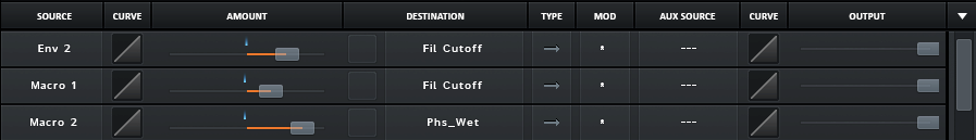 Эти источники модуляции существуют только в меню Source матрицы модуляции. Поэтому вы должны использовать окно матрицы, если вы хотите использовать эти источники модуляции. Кроме того, окно матрицы используется для присвоения вторичного источника AUX Source и/или его типа модуляции и количества.