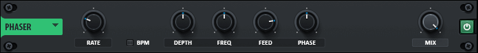 • BPM (синхронизация с темпом) - определяет, будет или нет развёртка фэйзера в синхронизации с темпом хоста. При включении ручка Rate будет привязана к музыкальным долям. Когда переключатель выключен, регулятор скорости в Гц.