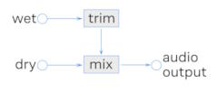 Trim - это компенсация усиления выхода при A/B сравнении. Используйте trim для компенсации уменьшеной громкости, в результате обработки. Trim настраивает только обработанный звук, как показано на диаграмме.