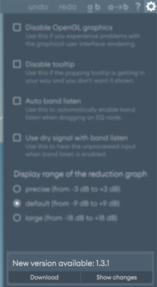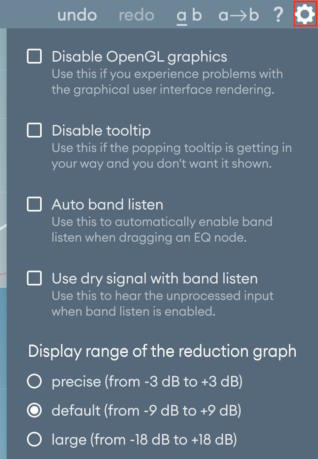 Откройте глобальное меню конфигурации, нажав на значок шестеренки в правом конце панели инструментов. В этом меню можно настроить множество параметров, влияющих на все экземпляры Soothe. Ниже приводится подробное описание различных настроек.