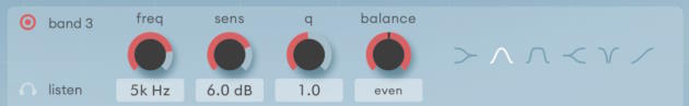 Sens или чувствительность полосы регулирует вес обработки выбранной полосы. Для удобства шкала показывает примерное значение в дБ, но не передаёт точного значения подавления, так как результирующая обработка зависит в основном от настроек depth и mix.