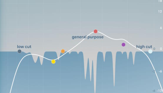 В Soothe есть пять диапазонов, используемых для настройки кривой: низкий срез, высокий срез и четыре (желтый, оранжевый, красный, фиолетовый) диапазона общего назначения. Полосы низкого и высокого среза имеют различную крутизну наклона, которую можно выбрать. Полосы общего назначения можно переключать от пикового типа на несколько различных типов: низкая полка, высокая полка, полосовая полка, вырезание полосы или наклон.