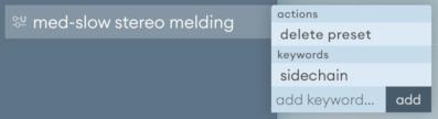Добавьте пользовательские теги к сохранённым пресетам, щёлкнув правой кнопкой мыши по названию пресета и воспользовавшись открывшимся меню. Впишите тег для пользовательского пресета в текстовое поле add keyword (добавить ключевое слово) и нажмите на кнопку add (добавить).