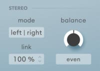 Cтереорежим переключает между обработкой mid/side (середина/стороны) и left/right (левый/правый). Все параметры связанные со стерео следуют за этой настройкой. Режим left/right с низким значением link (связь) обычно хорошо работает с исходным материалом с жестко панорамированными элементами. Режим mid/side со значением связи 100% является хорошей отправной точкой для любого сложного стереоматериала. Стереоизображение обычно становится шире при снижении значения link в режиме mid/side.