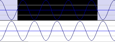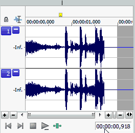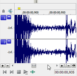 Также можно изменять масштаб громкости (амплитуды) звука, если к примеру у вас очень тихий звук и его плохо видно. Для изменения этого масштаба воспользуйтесь кнопками +/- в левом нижнем углу окна (Внимание громкость не изменится, изменится только отображение) см. анимированный рисунок ниже: