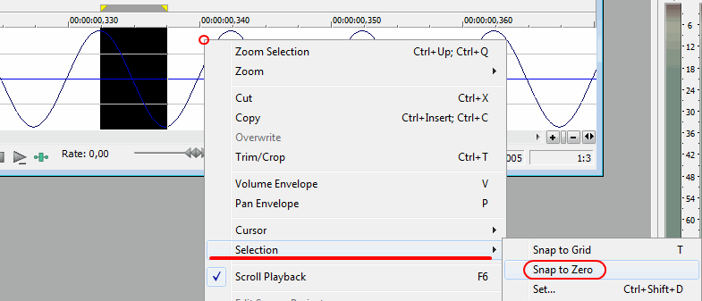 Если вам лень делать правильное выделение в ручную, то в Sound Forge для этого есть специальные опции. Попробуйте неправильно выделить участок и воспользоваться ими. Для вызова списка, нажмите правой кнопкой мыши по сэмплу (в любом месте):