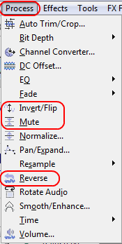 Разворачивает звук в обратную сторону (реверсия). Для примера возьмите какой нибудь сэмпл и загрузите в программу. После этого выделите ту область которую хотите повернуть, или не выделяйте если хотите реверсировать весь файл, и во вкладке Process выберите Revers:
