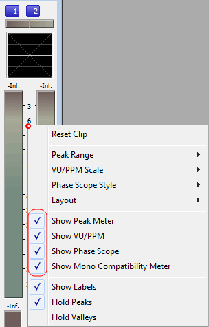 Вы можете отобразить пик метр, VU/PPM, измеритель фазы, а также метр моно-совместимости для каждого канала. Чтобы переключаться между метрами, щелкните правой кнопкой мыши в окне метра (см. рис. ниже) и выберите команду из контекстного меню.