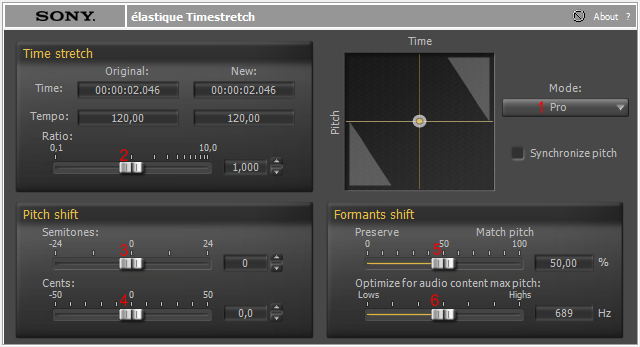 - Чтобы синхронизировать растяжение времени и питча, дважды щелкните по точке на графике Pitch/Time (см. рис. ниже):