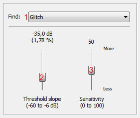 - В случае с пунктом Glitch параметр Threshold slope определяет крутизну шумового всплеска (шумовые всплески — проще говоря, пощелкивание и потрескивание — на диаграмме выглядят как острые выступы, и степень этих выступов измеряется крутизной).