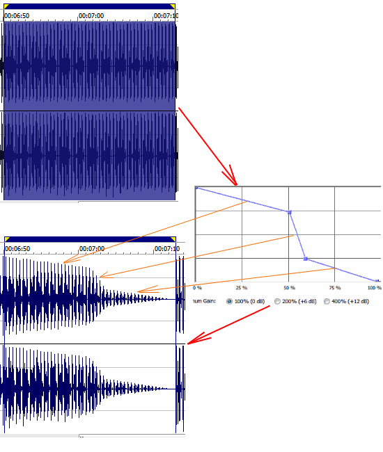 Выделите участок файла у которого хотите изменить огибающую громкости и примените данный процесс: