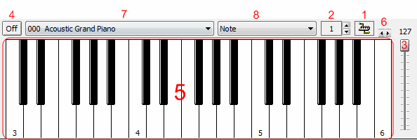 - Keys - На клавиатуре можно играть, нажимая левой кнопкой мыши на клавиши. Во время нажатия клавиатура посылает сообщение MIDI-порту и каналу, которые вы выбрали ранее, с указанной громкостью. Чем дольше вы держите кнопку мыши в нажатом состоянии, тем длиннее получается звук.