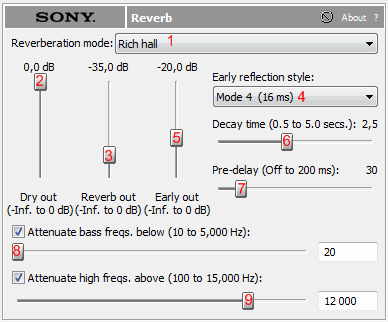 - Dry out - громкость "сухого" не обработанного эффектом реверберации сигнала;