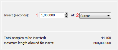 1. Insert (seconds) - Введите желаемую длительность фрагмента тишины (измеряемую в секундах), используя поле со счетчиком.