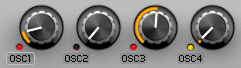Используйте ручки, обозначенные OSC1, OSC2, OSC3, OSC4 для настройки громкости каждого осциллятора. Когда ручка повёрнута полностью влево осциллятор полностью отключается и светодиод гаснет. В положении ручки 1-30 (светодиод жёлтый). Значения между 1-30 (жёлтый светодиод) не создают звука, но эти значения используются когда осциллятор используется в качестве модулятора.