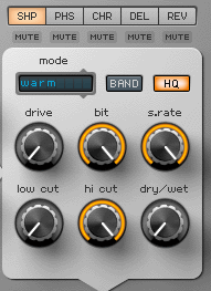 Soft (мягкий), Warm (тёплый), Hard (жёсткий), Clip (клиппинг), Tube1 (лампа1), Tube2 (лампа2), Tube3 (лампа3), FBsin (синусоида обратная связь), FBtri (треугольник обратная связь), Flt+dcm (фильтрация+прореживание), DCM (только прореживание).