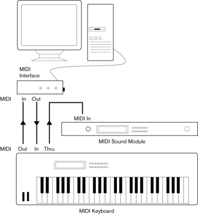 В этом примере мы предполагаем, что у вас есть MIDI клавиатура и внешний звуковой MIDI модуль. Клавиатура используется как для передачи на компьютер MIDI-сообщений для записи, так и для воспроизведения MIDI-треков. Звуковой модуль используется только для воспроизведения. Используя в Cubase функцию MIDI Thru (см. ниже) во время игры на клавиатуре или записи вы сможете услышать правильный звук от звукового модуля.