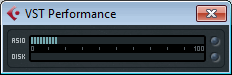 Окно VST Performance открывается из меню Devices. Оно показывает два дисплея измерителей: измеритель ASIO показывает загрузку процессора, а Disk скорость передачи данных жесткого диска. Мы рекомендуем вам проверять это окно время от времени, или держать его всегда открыты. Даже если вы смогли активировать несколько звуковых каналов в проекте без получения предупреждений, вы можете столкнуться с проблемами производительности при добавлении эквалайзера или эффектов.