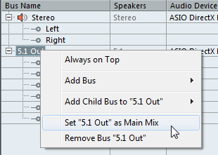 Любые выходные шины в окне VST Connections могут быть выходной шиной по умолчанию. Щёлкнув правой кнопкой мыши по имени выходной шины, вы можете установить её в качестве основной шины микса (Main Mix).