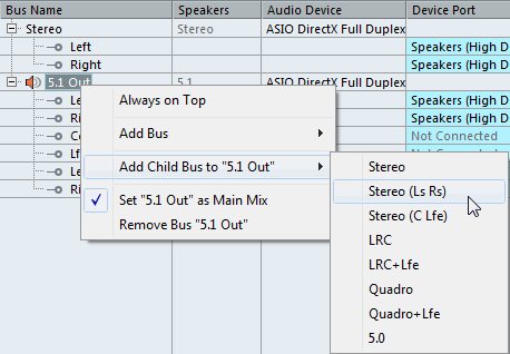 1. В столбце Bus Name, выберите сурраунд шину и щёлкните правой кнопкой мыши, чтобы открыть контекстное меню.