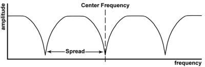 Ручка Spread определяет расстояние между вырезами в спектре частот. При небольшом значении Spread вырезы располагаются близко друг от друга, что даёт классический эффект фэйзера.