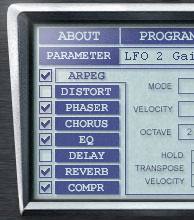 LCD экран в середине пользовательского интерфейса содержит семь звуковых эффектов и арпеджиатор. Главные эффекты применяются в конце звукового потока, после всех обработок. Каждый эффект имеет собственную группу параметров настройки на LCD экране. Чтобы переключиться между различными эффектами, нажмите на название эффекта в левой стороне экрана.
