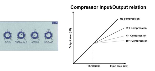 Ручка Threshold устанавливает минимальный уровень амплитуды, выше которого компрессор начинает срабатывать. Если Threshold равно 0, то компрессии вернее всего не будет, потому так как чаще всего уровень на входе не превышает 0 dB. Значение Threshold -30 dB означает, что всё, что громче -30 dB будет сжато.