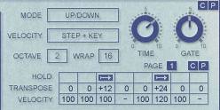 У основания группы Arpeggiator вы найдете пошаговый секвенсор. Он предназначен для расположения нот в заданном порядке. Параметр Transpose определяет высоту каждой ноты, которые будут добавлены к ноте, взятой на клавиатуре. Например значение +12 означает, что высота нот будет изменена точно на 12 полутонов (одна октава). Установки Transpose используются только тогда, когда параметры арпеджиатора установлены на Step Seq или Step Chord. Параметры Velocity определяют с какой скоростью будет проигрываться каждая нота. Если Velocity устанавливается в "-",нота не будет сыграна вообще. Кроме того длительность каждой ноты может быть продлена, используя опцию Hold и например для созданя глиссандо.