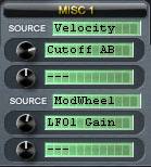 Данная панель позволит вам воспользоваться другими модуляционными ресурсами такими как: velocity, aftertouch, keytrack, modwheel, amplitude envelopes и modulation envelopes и LFOs. Панель имеет 4 слота для вышеперечисленных ресурсов модуляции, это предоставляет вам большое разнообразие вариантов модуляции. И опять же, уровень каждого параметра модуляции может быть изменен, маленькими вращающимися ручками.