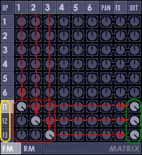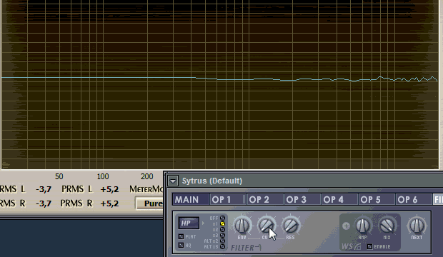 В синтезаторе Sytrus есть 3 одинаковых фильтра (но их можно настроить по разному). Для того чтобы отправить оператор на фильтр поверните ручки в красной области как показано на рисунке ниже: