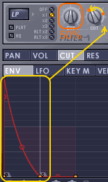 Т.е. регулятор Cut задаёт частоту середины огибающей. А параметр ENV - то, на сколько процентов она изменяет значение регулятора Cut вверх и вниз.