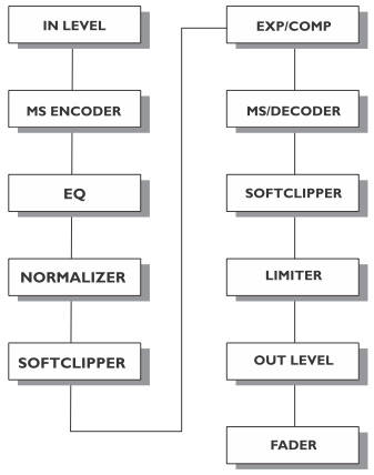При использовании раздела эквалайзера (расположенного перед нормализатором) усиление могло быть увеличено или уменьшено. Нормализатор используется для оптимизации коэффициента усиления прежде, чем звук попадёт в раздел Exp./Comp.