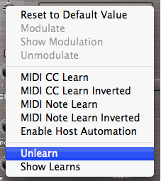 • Unlearn: Выберите эту опцию, чтобы аннулировать все назначения функции MIDI Learn, включая назначения хост автоматизации для данного параметра.