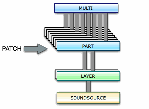 Установки всех восьми частей сохраняются с мультиинструментом, или с проектом и вызываются при загрузке этого определенного мультиинструмента или проекта. Установки части могут быть также сохранены индивидуально в качестве патча. Патч содержит все параметры звука, и может быть загружен в любую из этих восьми частей.
