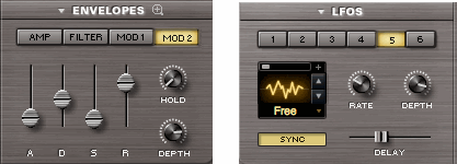 Общие параметры содержат: параметры LFO (LFO1 ~ LFO6) и два параметра Modulation Envelopes (MOD 1 & MOD 2). Кроме того, каждый слой включает свой собственный набор эффектов, и общий набор эффектов для обоих слоев.