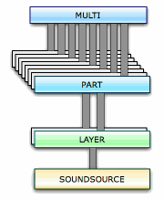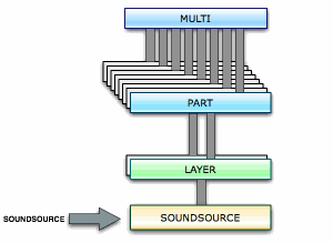 Мультиинструменты, занимающие верхнюю ступень иерархии Trilian состоят из восьми частей (Parts), вместе с четырьмя модулями Aux эффектов и модулем Master эффектов.