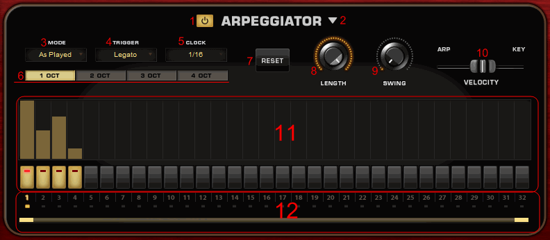 10. Слайдер Velocity - Этот контроллер определяет, насколько сила давления на клавишу входящих нот воздействует на динамику паттерна Арпеджиатора. При максимальном значении сила давления на клавишу клавиатуры игнорирует все velocity установки в шагах Арпеджиатора. Как только значение параметра приближается к минимуму, velocity значения каждого шага будут определять динамику паттерна Арпеджиатора. Вообще установка 50 % - хороший баланс, так как она позволяет входящему MIDI velocity значению взаимодействовать с динамикой паттерна.