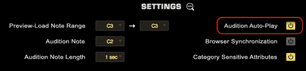 Чтобы прослушать сыгранную ноту выбранного звука, нажмите кнопку Audition в Нижнем колонтитуле Браузера. Звук будет продолжаться до тех пор, пока будет нажата кнопка Audition. Опция "Audition Note" (нота для прослушивания) в окне Settings Zoom Браузера определяет ноту для прослушивания.