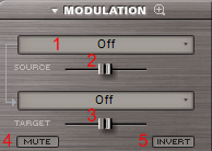 3. Кнопки секции Modulation Status - Секция содержит две кнопки Mute & Invert. Кнопка Mute фактически разъединяет направление модуляции. Это быстрый способ прослушать действие эффекта на часть. Контроллер Invert переключает между положительной или отрицательной модуляцией.
