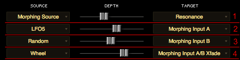 4. Секция Morphing Input A/B Xfade - Это направление определяет то, что будет управлять трансформацией между двумя входами A/B - поэтому Источник, определяемый здесь должен быть источником, который подходит для этого вида кроссфейдинга. Примеры Входов трансформации для A/B Xfade: