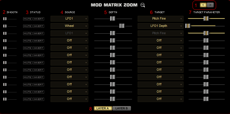 1. Кнопки переключения страниц Mod Matrix - Эти кнопки служат для переключения между двумя подстраницами Mod Matrix. Вообще, возьмите за правило заполнять первую страницу модуляции перед добавлением любых направлений модуляции на второй странице модуляции. Каждая страница отображает двенадцать направлений одновременно. Матрица модуляции (Mod Matrix) отображает направления модуляции для обоих Слоев одновременно.