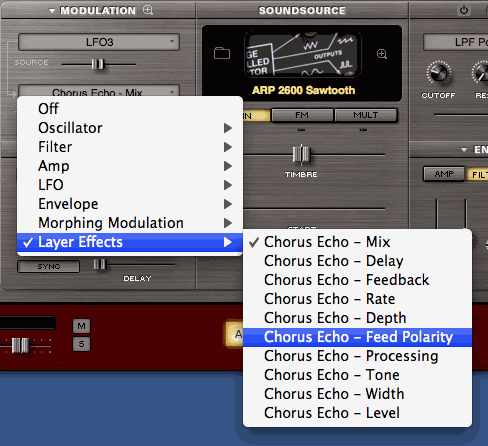 • Меню Modulation Effects - Любой эффект, который добавляется к Эффектам Слоя (A или B) доступен как назначение модуляции.