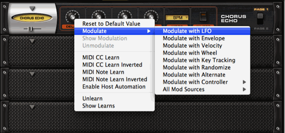 1. Модуляции могут быть установлены на лету, правым щелчком мыши на параметре и выбором источника модуляции из выпадающего меню