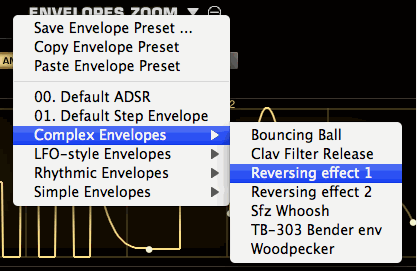 Доступ к меню Envelope Presets обеспечивают два выпадающих меню. Первое находится на странице Edit рядом с лейблом ENVELOPES, второе находится в окне Envelopes Zoom около лейбла ENVELOPES ZOOM. Выпадающие меню отображают список различных пресетов Огибающих, а так же опции сохранения, копирования и вставки огибающей. Меню Envelope Presets содержат все контуры огибающих. Функция Save Envelope Preset позволяет сохранить огибающие для последующего применения. Огибающие могут быть скопированы в другие Слои или Части, используя опции копирования/вставки пресетов огибающей, обеспечивая быстрый и удобный способ работы с Огибающими. Trilian включает большое количество интересных и полезных пресетов в меню Envelope Presets.