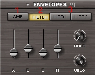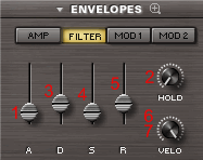 2. Огибающая Filter - У каждой Части также есть две специализированные Filter-огибающие, также по одной на каждый Слой, A и B. Эти огибающие формируют срез Фильтра для каждого Слоя. Специализированный регулятор Velocity управляет динамикой Filter-огибающих, основываясь на параметре MIDI Velocity.